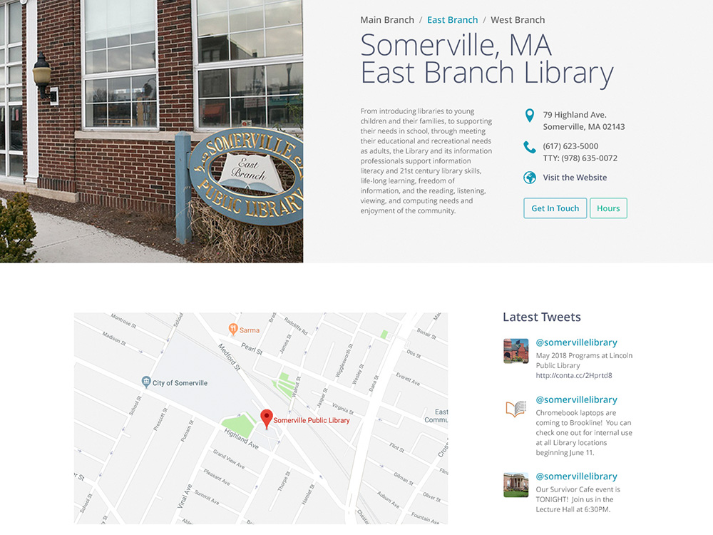 The Minuteman Library Network is comprised of 41 public and academic libraries in the MetroWest region of Massachusetts. We presented each library in an organized way focused on the contact details, map location, and latest tweets.