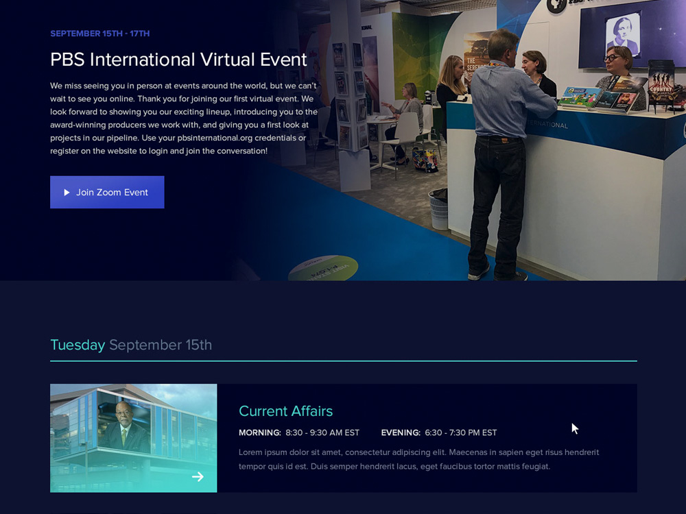 PBS International’s annual conference plans were disrupted by the ongoing COVID-19 pandemic, so we helped the bring the same customer-focused experience online. We built a micro-site featuring a schedule of live Zoom sessions with sales staff on-hand to answer questions in real-time. The whole micro-site is content-manageable by PBS, and easy to duplicate for future events.