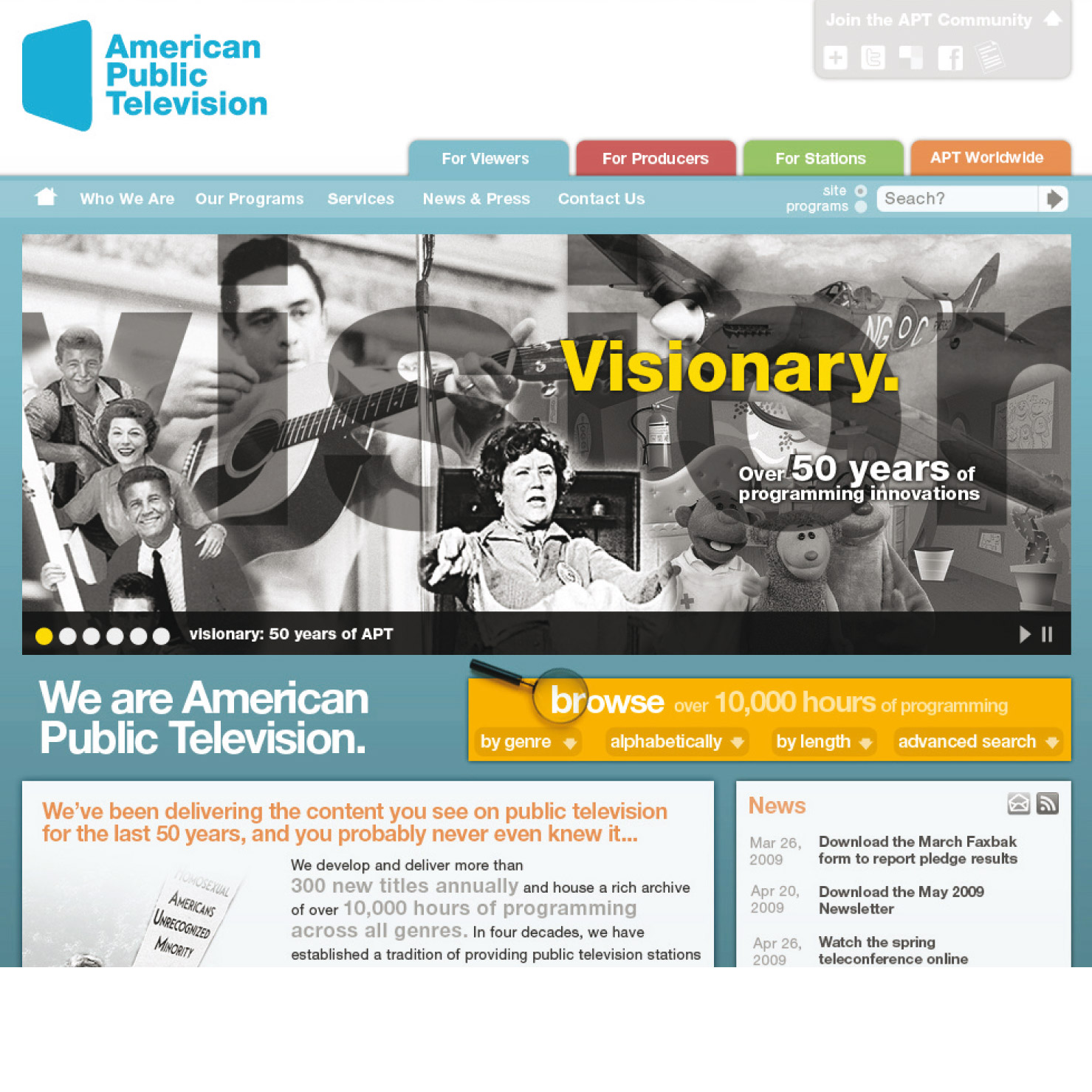 American Public Television (APT) has won its second award for their new website redesign by Metropolis Creative. APT has been a leading distributor of high-quality, top-rated programming to America’s public television stations since 1961. Since 2004, APT has distributed approximately half of the top 100 highest-rated public television titles. APT was the winner of our First Annual Extreme Website Makeover Event!