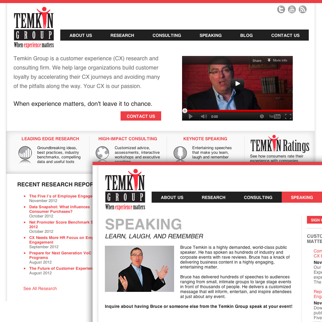 Recently, Metropolis Creative re-designed The Temkin Group’s website. The Temkin Group wanted a bolder look to their site to reflect their strong passion for customer experience. The new website design is content managed with a WordPress back-end system that allows for easy growth and changes down the road. Their key service offerings are highlighted by custom icons for Research, Consulting, and Speaking. Dynamic content, including recent reports, blogs, and industry facts, flows onto the home page to improve search engine optimization.