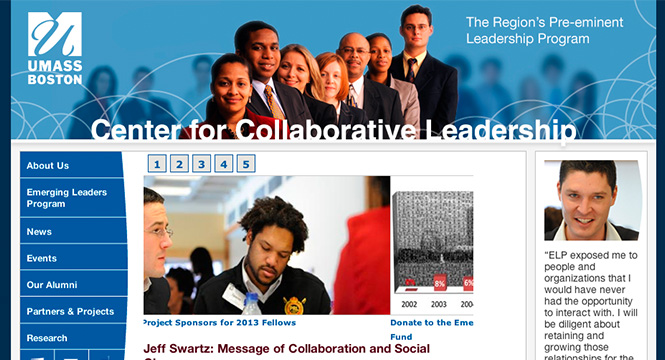 Metropolis Creative, in partnership with Spotlight Communications, proudly announces the launch of UMass Boston’s Emerging Leaders Program web site. The new site design includes visual imagery that supports the overall message/brand of the program, and intuitive and easy user access. The site also meets the project goals of showcasing the program alumni, and providing a content management system that can be used by department staff for on-going updates. The whole site was built using W3C’s standards and is ADA compliant per the University’s guidelines. This means that not only is it accessible to visually impaired visitors, but it is also designed for most mobile devices.