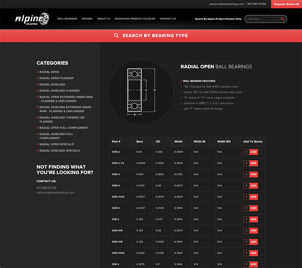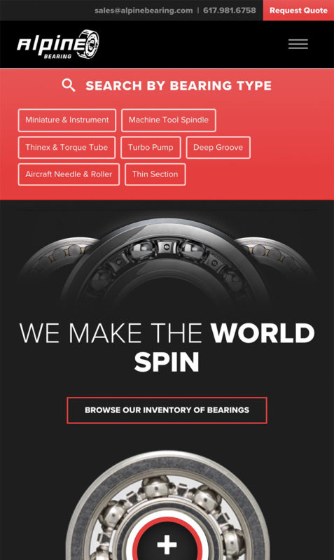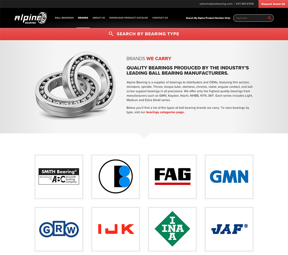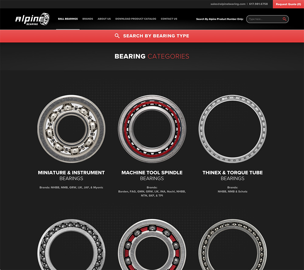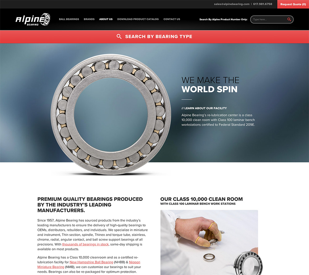 Alpine’s web site design revolves around the ability to search and find bearings. Metropolis implemented a custom search tool that brings the visitor to a shopping cart ordering system. We shot custom photography of both the ball bearings and Alpine’s clean room.