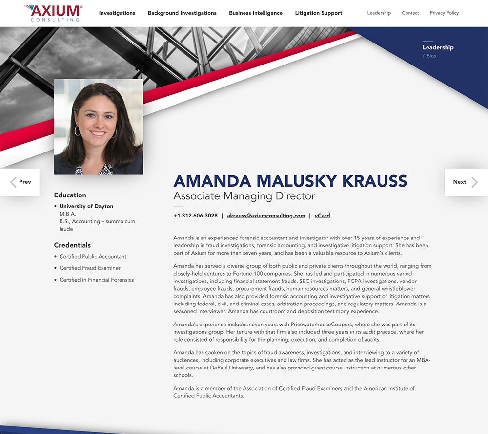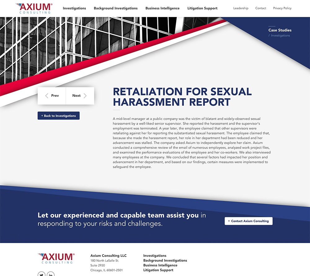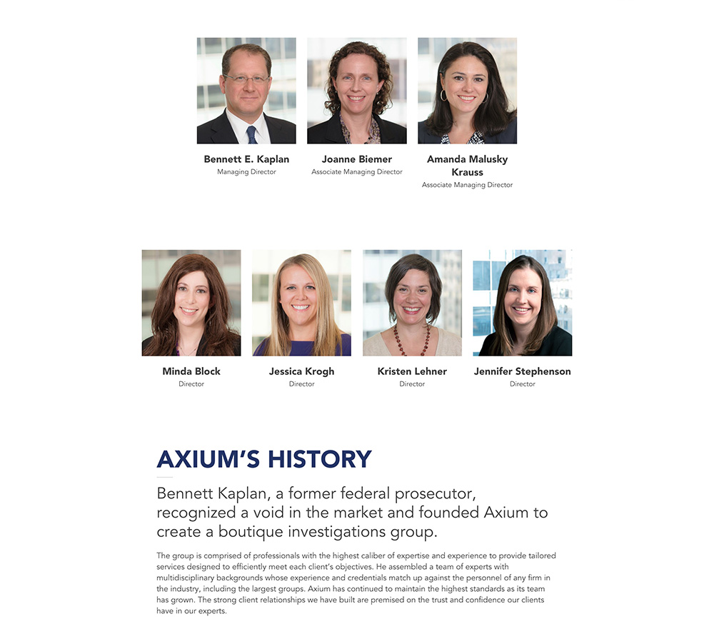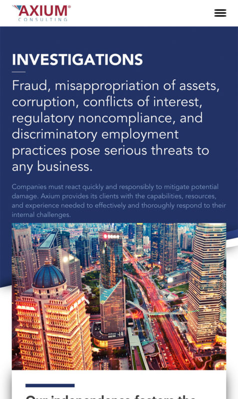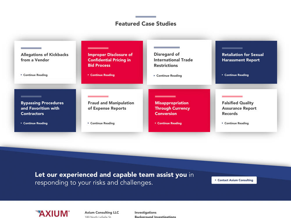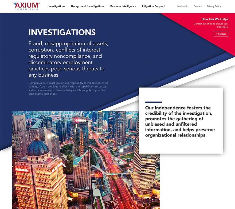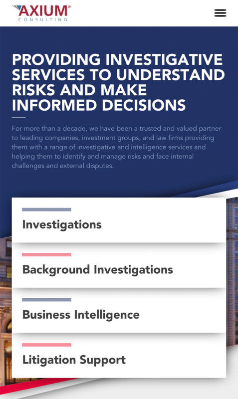 Axium’s bold colors and sharp angles make the company feel like a strong leader in the investigation and intelligence space. The custom design elements help define Axium as a different kind of company.