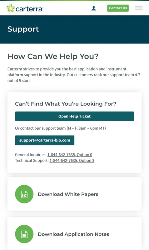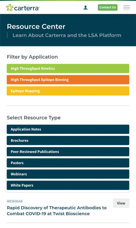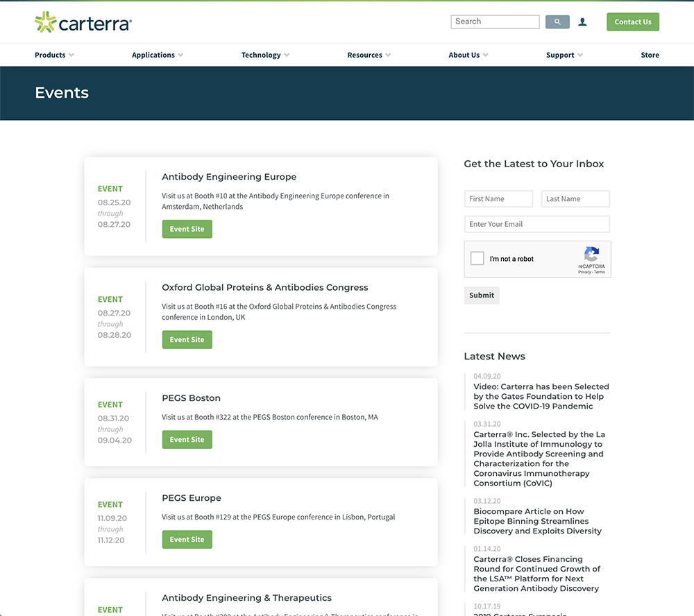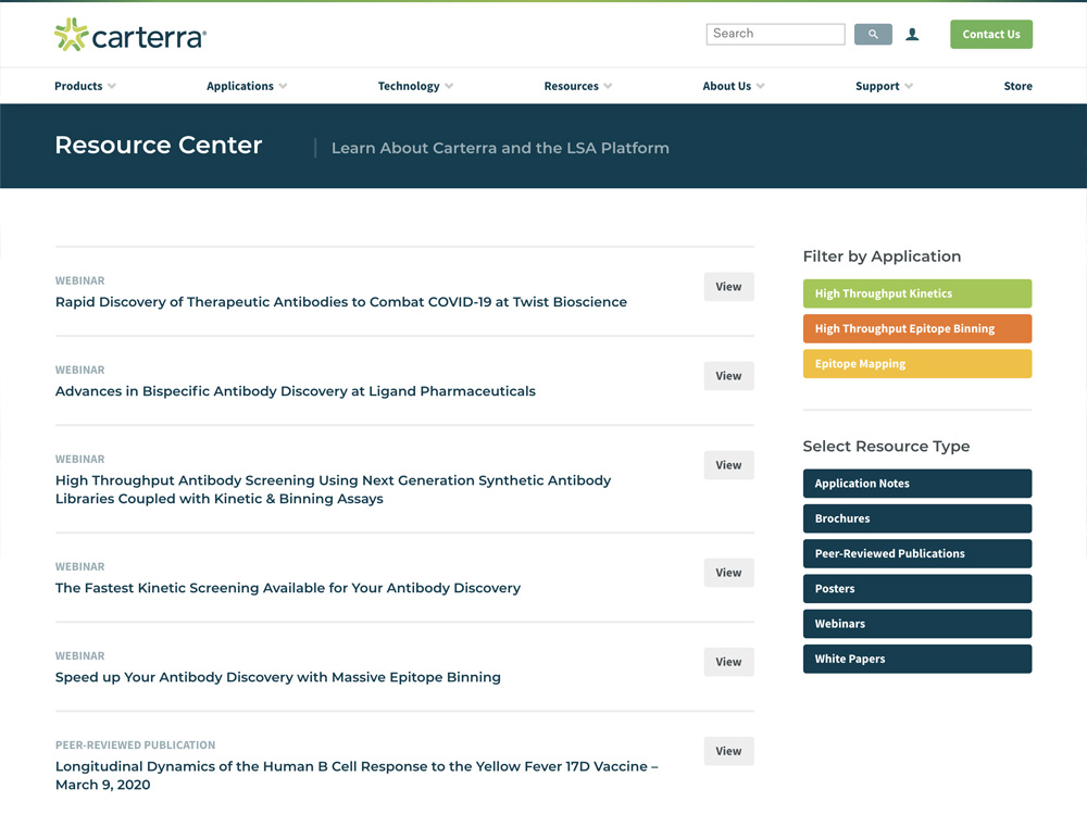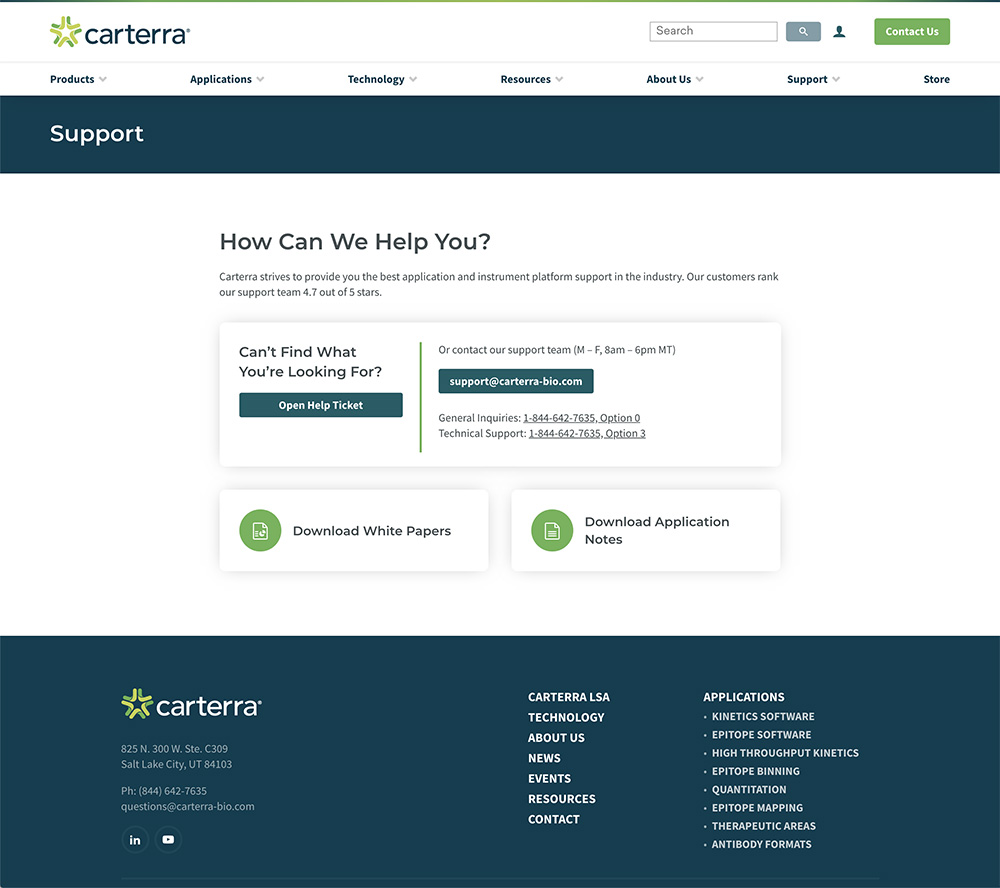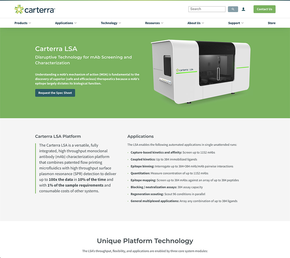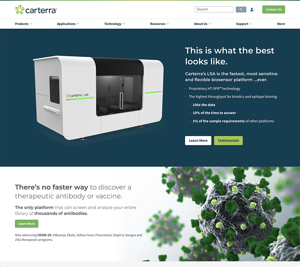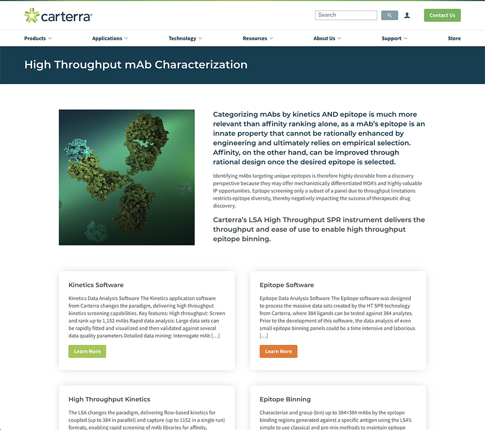 Carterra offers a single product with a longer sales lead time, so the website redesign needed a resource area with lead-capture capability for marketing purposes. We also added a store built in WooCommerce to sell consumables and other supporting items. The home page offers four initial content funnels that lead to different application areas. The applications pages dynamically pull in related resource content which in turn, generates leads. We created a custom theme on the WordPress platform.