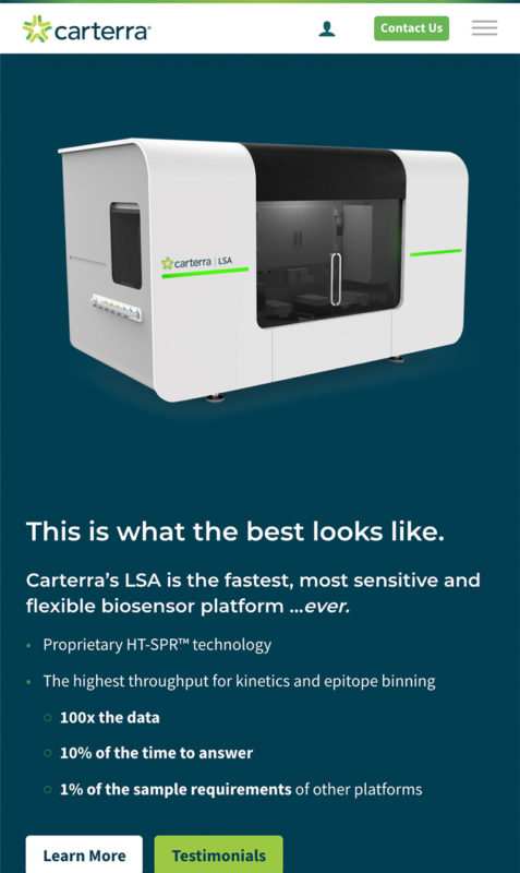 Carterra® Inc. develops highly parallel microfluidic devices for drug discovery and life science research applications. Their technology uses a network of microchannels that uniquely enable flow-based array printing of proteins and antibodies on sensor surfaces. Carterra delivers high-resolution data for critical biotherapeutics applications at throughputs 10 – 100 times faster than existing platforms, compressing months of work into days.