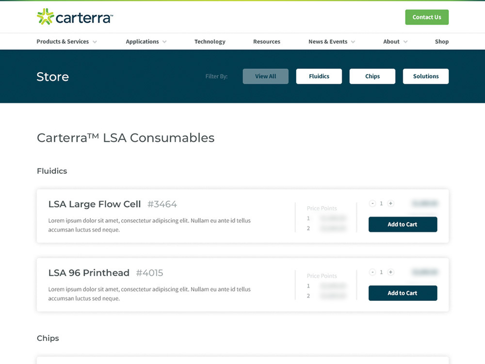 The online store is accessible only to logged-in customers with accounts that are moderated by Carterra. Their main product isn’t available online, but the new store makes it easy for customers to purchase consumables. Bulk discounts are automatically applied and multiple payment options are available to the customer.