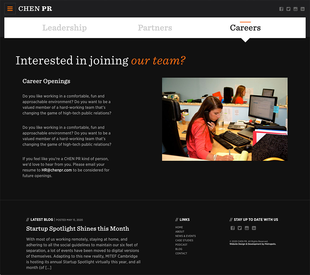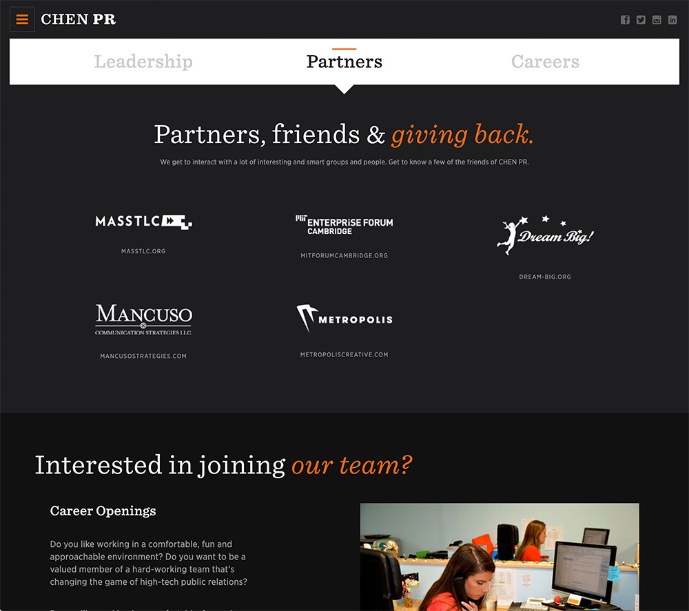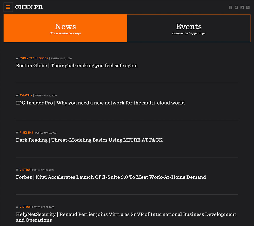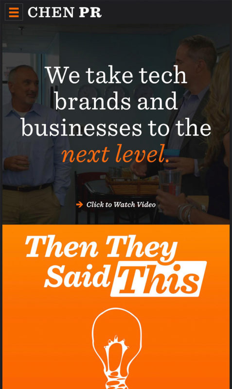 CHEN’s successes speak for themselves. The website leads with a professional quality video featuring clients talking about working with CHEN. An interchangeable case study sits to the right of the video. Below that are recent client news coverages, and the page ends with a collection of social media snapshots. Together, the elements tell a perfect brand story of who CHEN is, and what they can do for their clients.