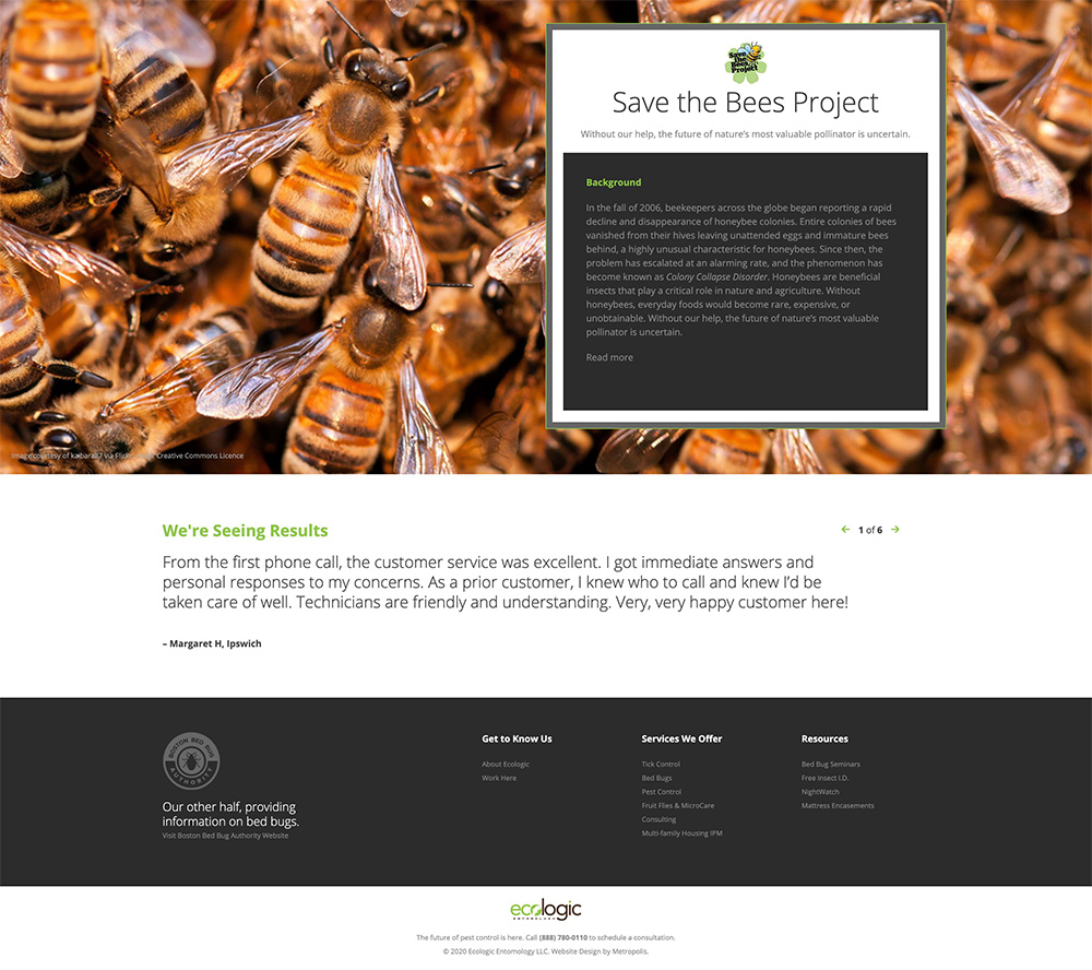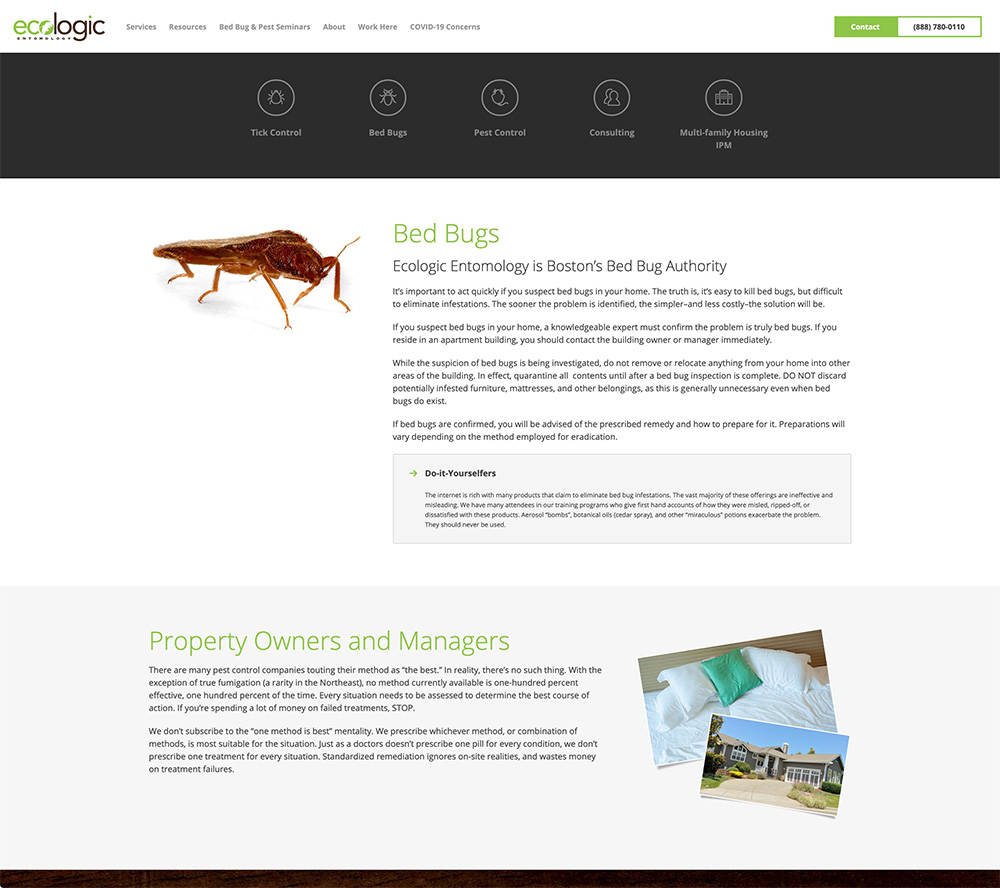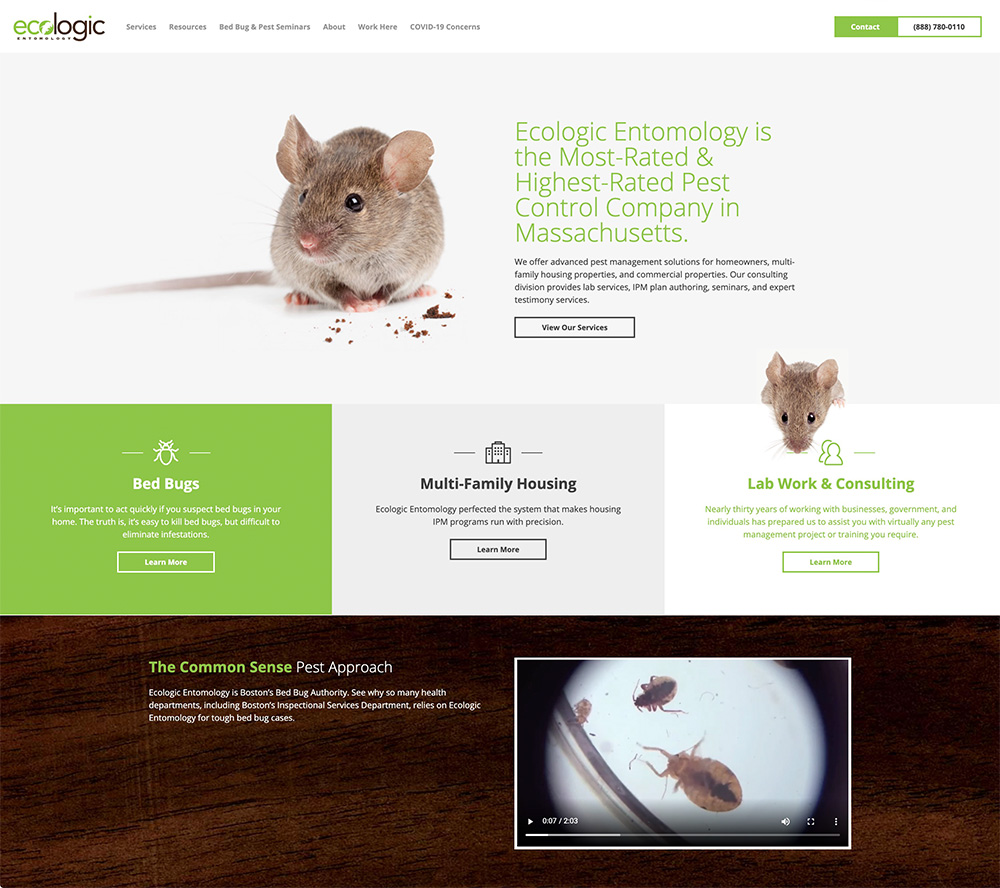 Ecologic Entomology makes pest management easy and approachable. Large images of non-creepy-looking pests were used throughout the site to keep it interesting and engaging. Special attention was paid to their search-engine-optimization for specific terms. The site is responsive and loads a different mobile layout for phones. Ecologic delivers pest management services to communities in and around Boston. They have expertise with bed bugs, multi-family housing, and lab work & consulting.