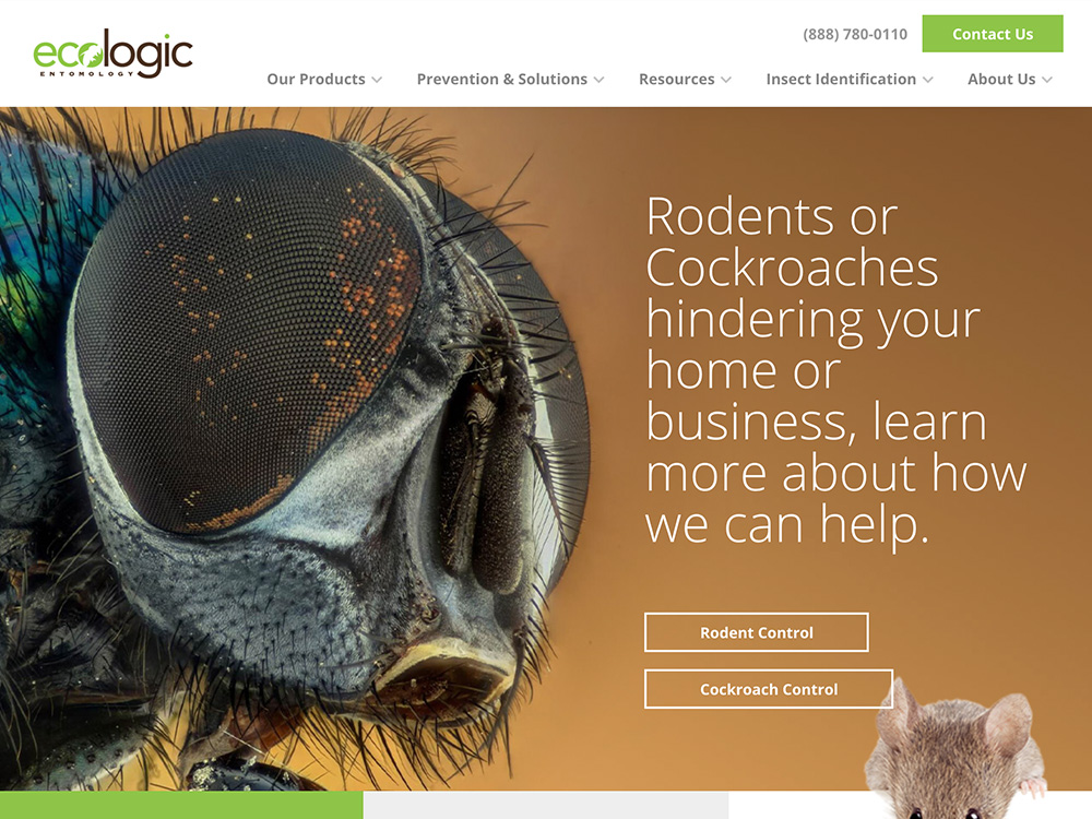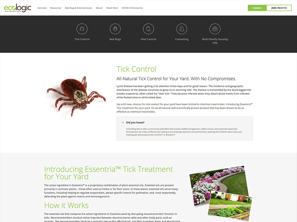 Large photos and bright colors help make this website friendlier and more approachable. Ecologic positions themselves as experts who care and understand enomology. Their competitors often focus on the destruction of pests vs. management.