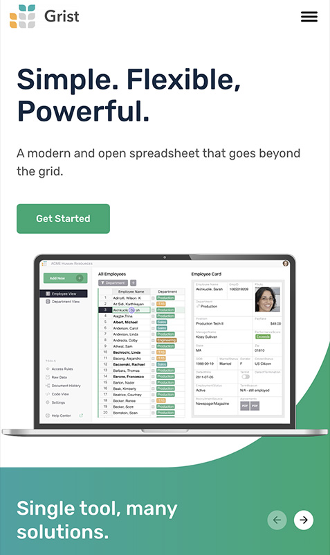 Grist is a an online relational spreadsheet database that empowers you to organize your data, your way. It is flexible to build custom, no-code applications that streamline workflows and reduce tool sprawl.