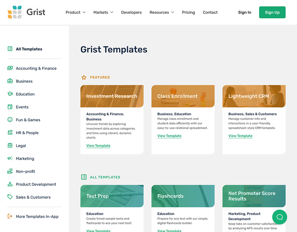 In addition to the platform’s ability to organize your spreadsheets, they offer pre-formatted templates to help get you started. We built a user-filterable template archive for users of different industries to choose from.