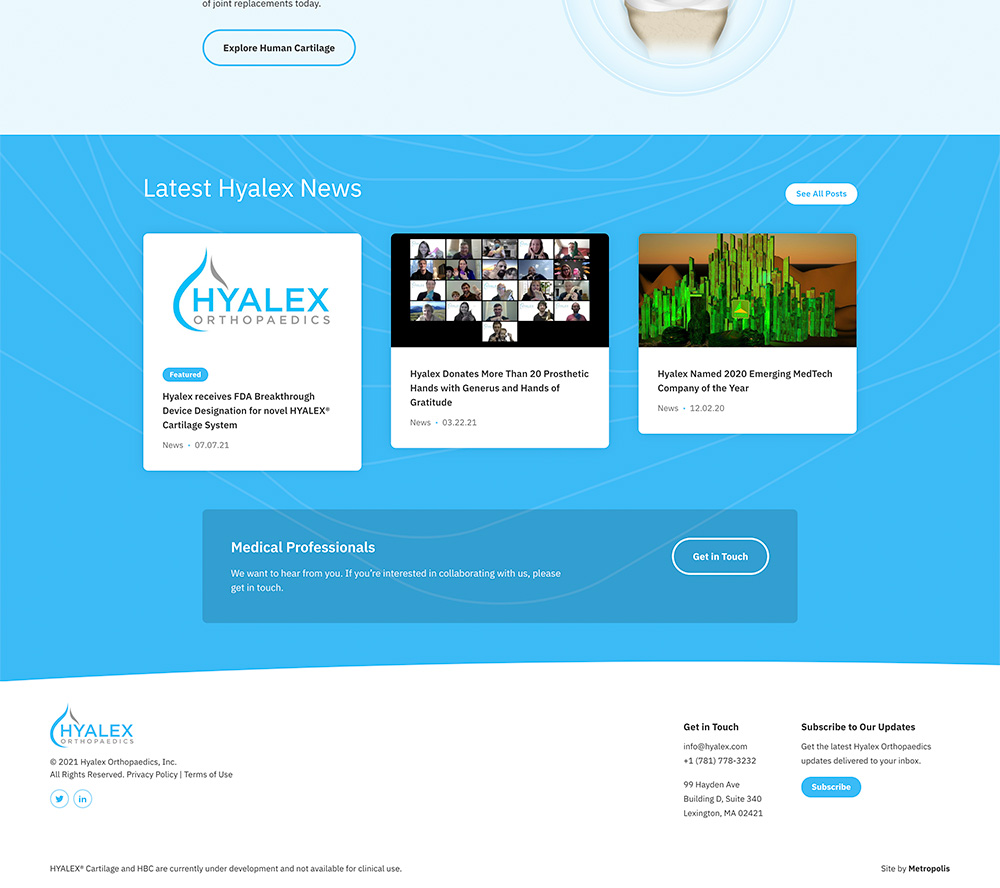 HYALEX® Cartilage is designed to mimic the form and function of native hyaline cartilage. It has the potential to be applied to products in any articulating joint in the body as well as applications beyond the clinic. For decades, clinicians and researchers have been investigating methods of cartilage repair, but no approach has yet been deemed the gold standard. Cartilage injury and osteoarthritis are the leading causes of joint replacements today.