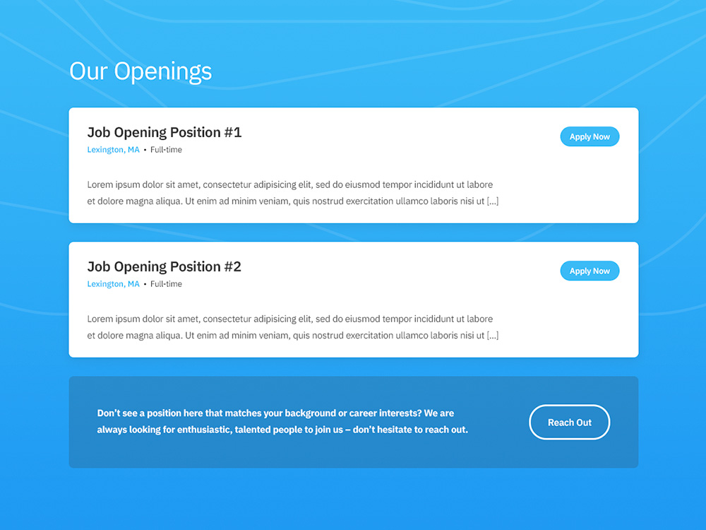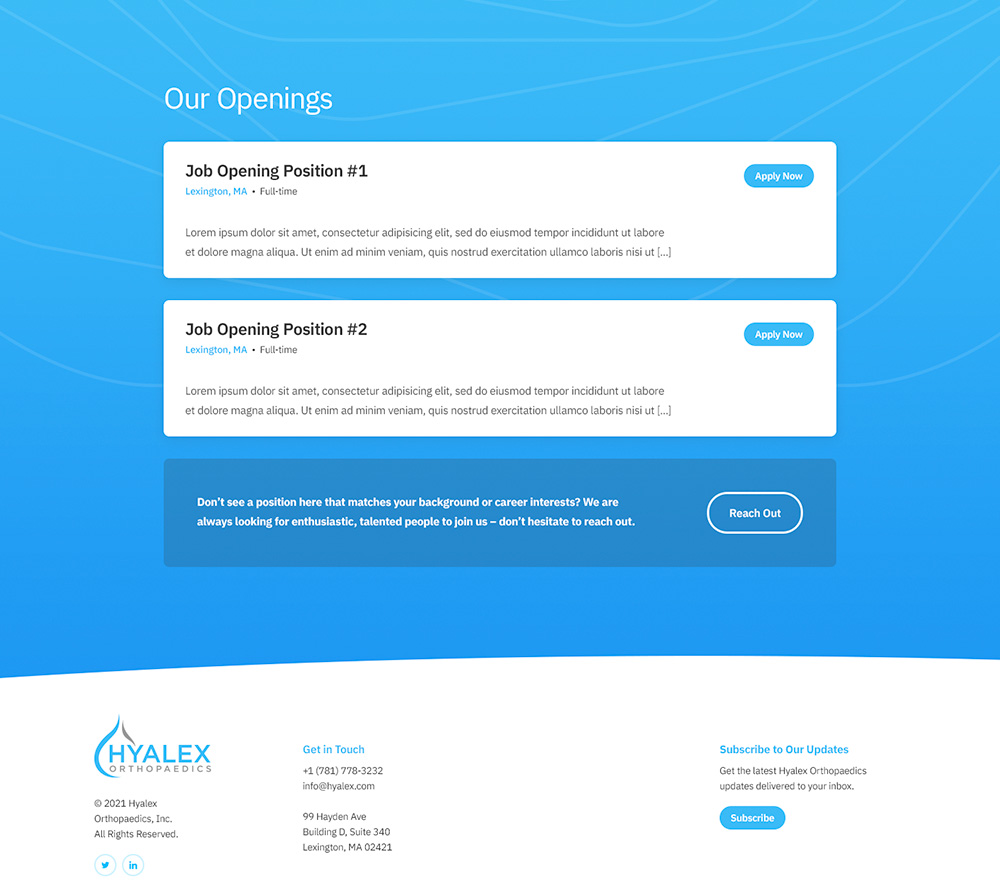 The careers page starts off with a cheery representation of their company as the perfect place to work, with an emphasis on employee culture. Jobs are pulled dynamically from the Breezy applicant tracking system and displayed on the website.