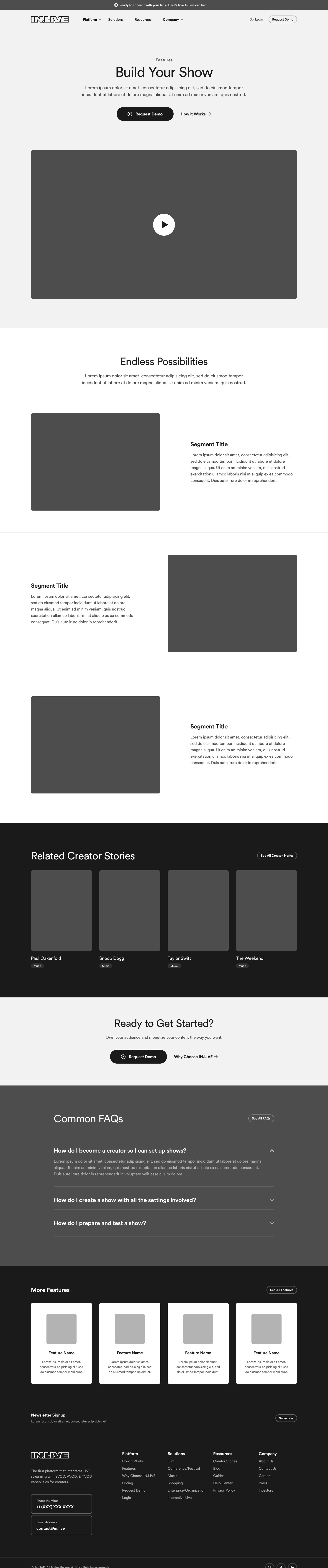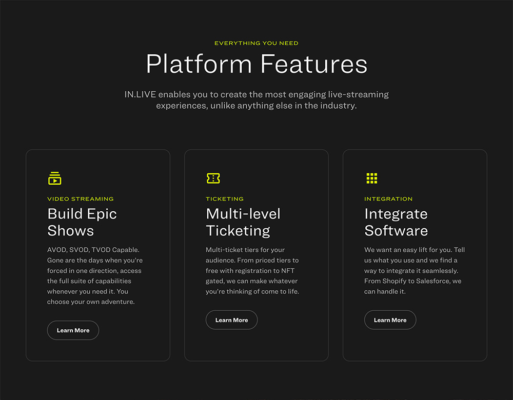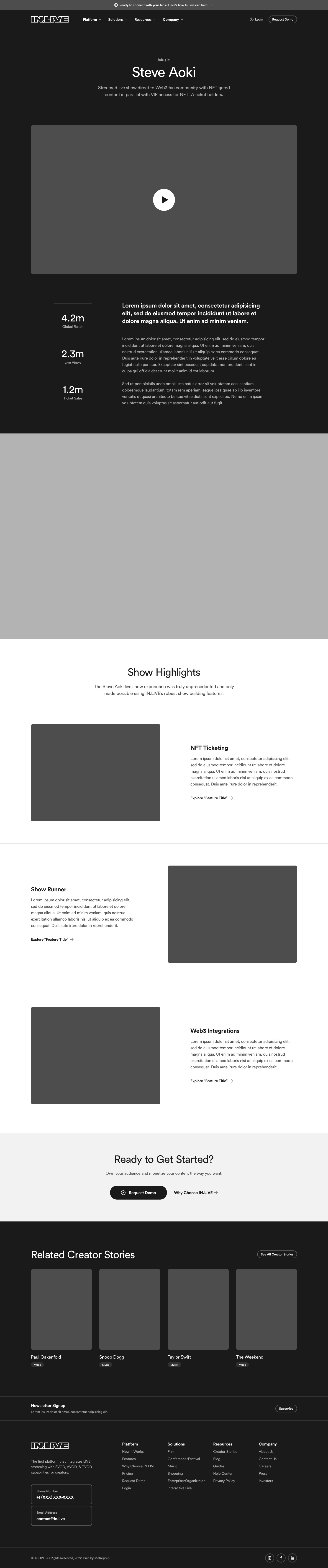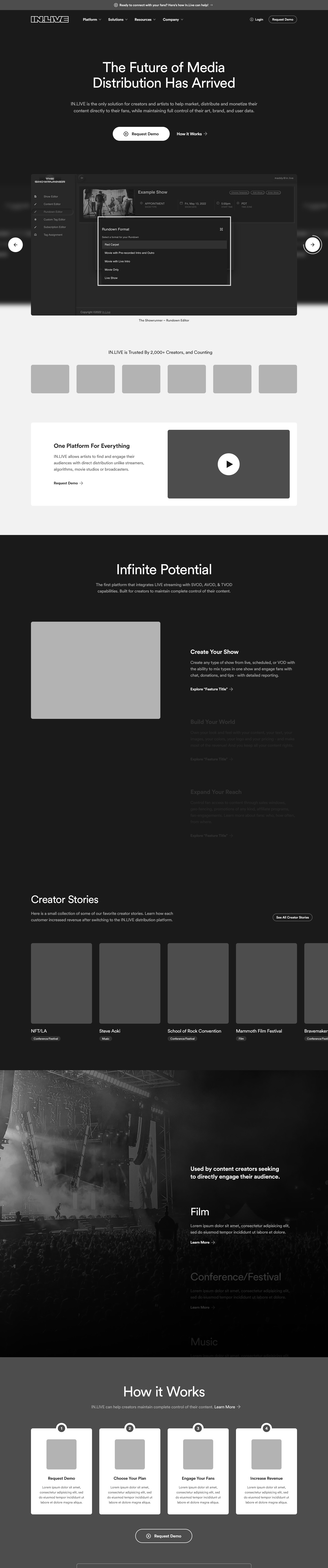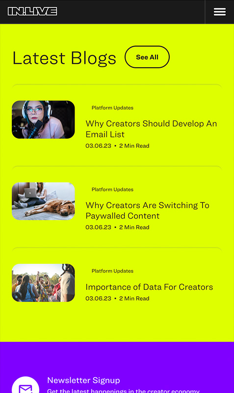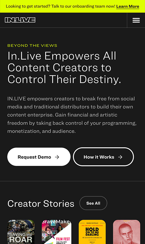 Each creator on the In.Live platform can create a microsite to help promote their special event or digital channel. After we launched the main site, we designed layouts for several microsites adhering to each creator’s unique visual brand.