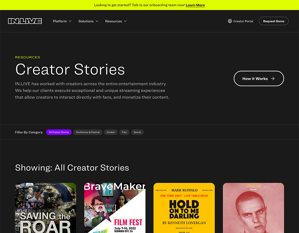 In addition to emphasizing the platform’s core features to engage the user, we also needed to strongly emphasize the creator stories, an archive of first-hand success stories by different creator types using the In.Live platform.