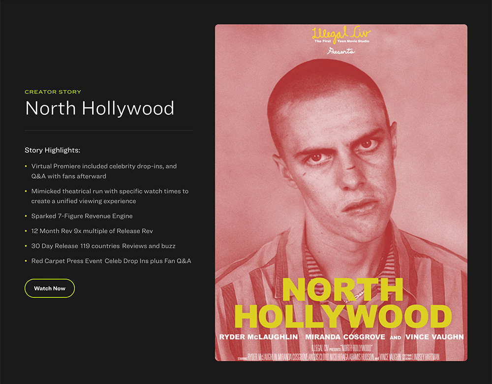 Clients can design their run of show, distribute to a global audience, and monetize with our built-in robust ticketing features. Each creator site that mirrors their brand and serves as a distribution and promotion center, while also controlling ticketing data and revenue. Available world-wide. Customers include film projects, music concerts, corporate events, sporting events, and high profile content creators.
