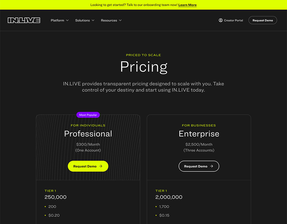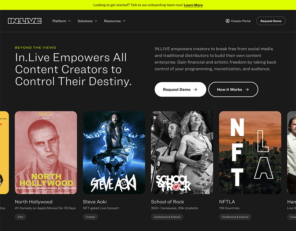 In.Live allows content creators to host virtual performances and own that data. This enables live interactions during the event, future market opportunities, content subscription offerings, and other forms of e-commerce models currently unavailable on mainstream platforms.