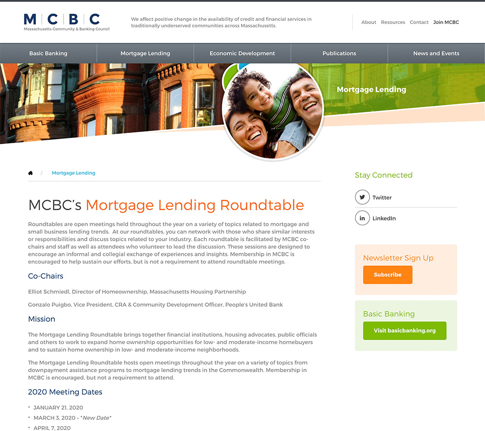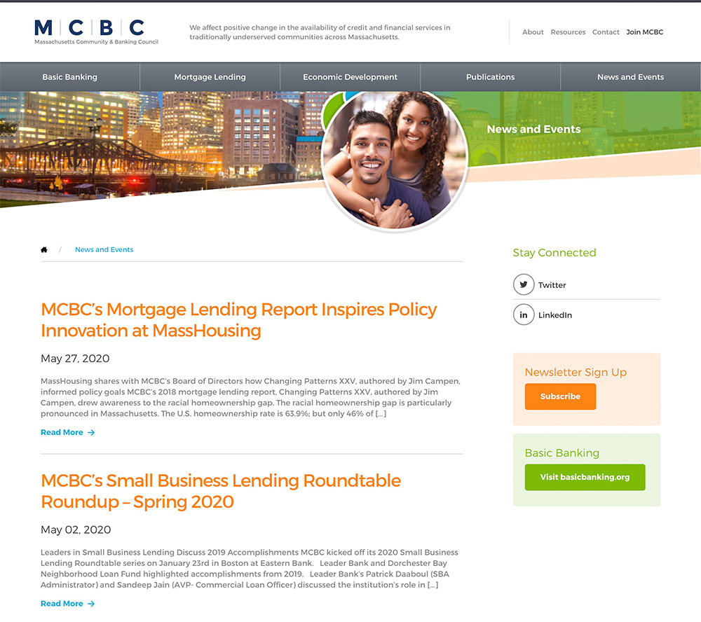 Massachusetts Community & Banking Council was established in 1990 to provide a collaborative forum for Massachusetts financial institutions and community organizations to meet and share information with the goal of affecting positive change in the availability of credit and financial services in traditionally underserves communities across the Commonwealth.