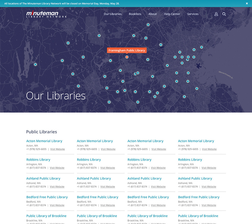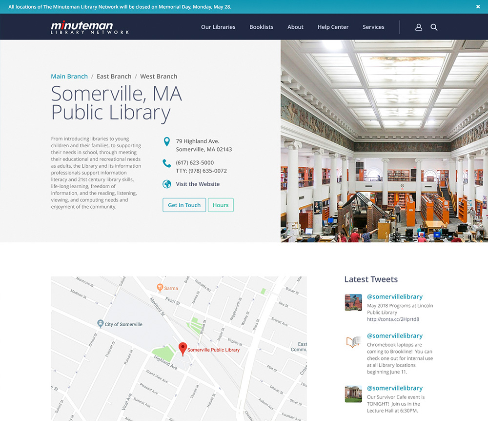 The Minuteman Library Network is comprised of 41 public and academic libraries in the MetroWest region of Massachusetts. We presented each library in an organized way focused on the contact details, map location, and latest tweets.