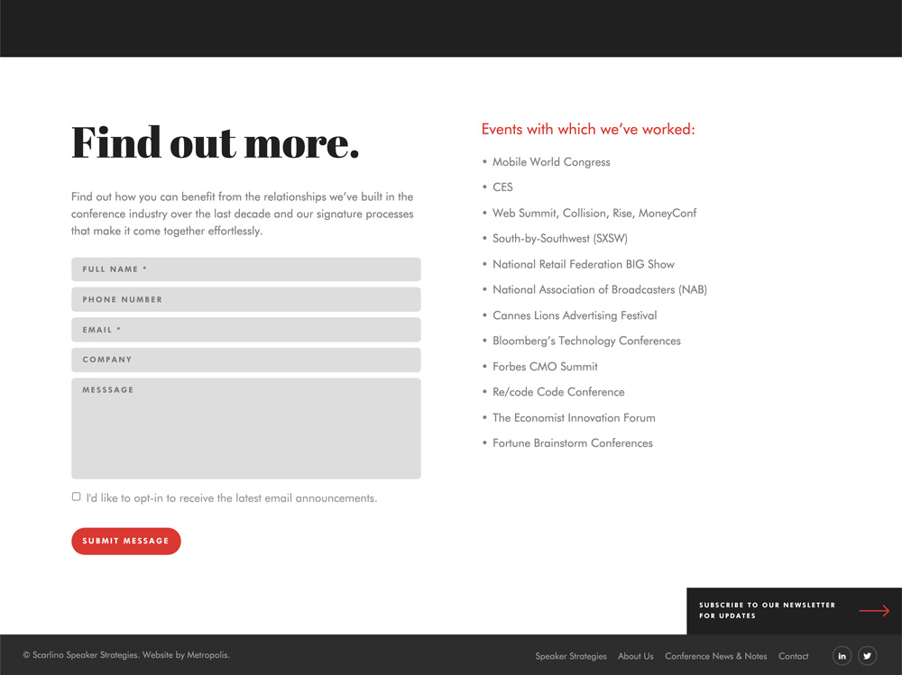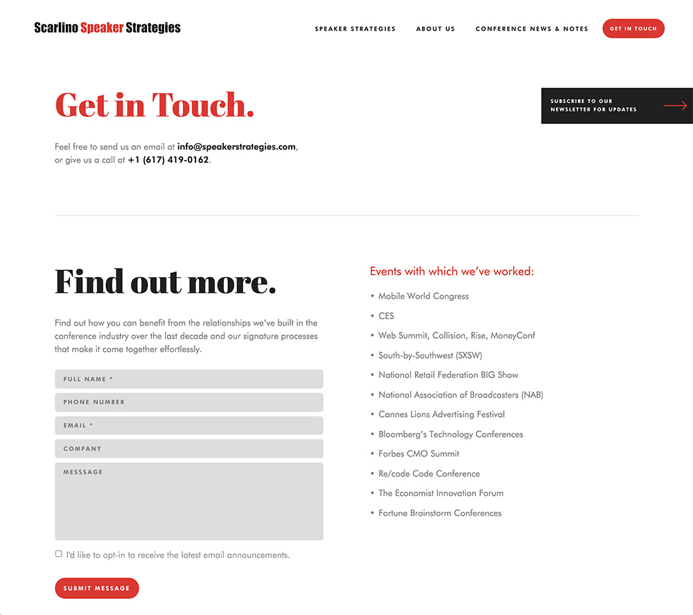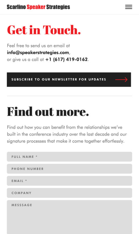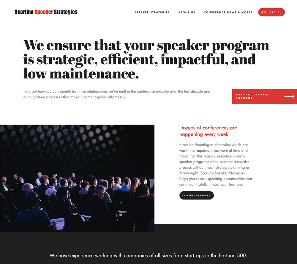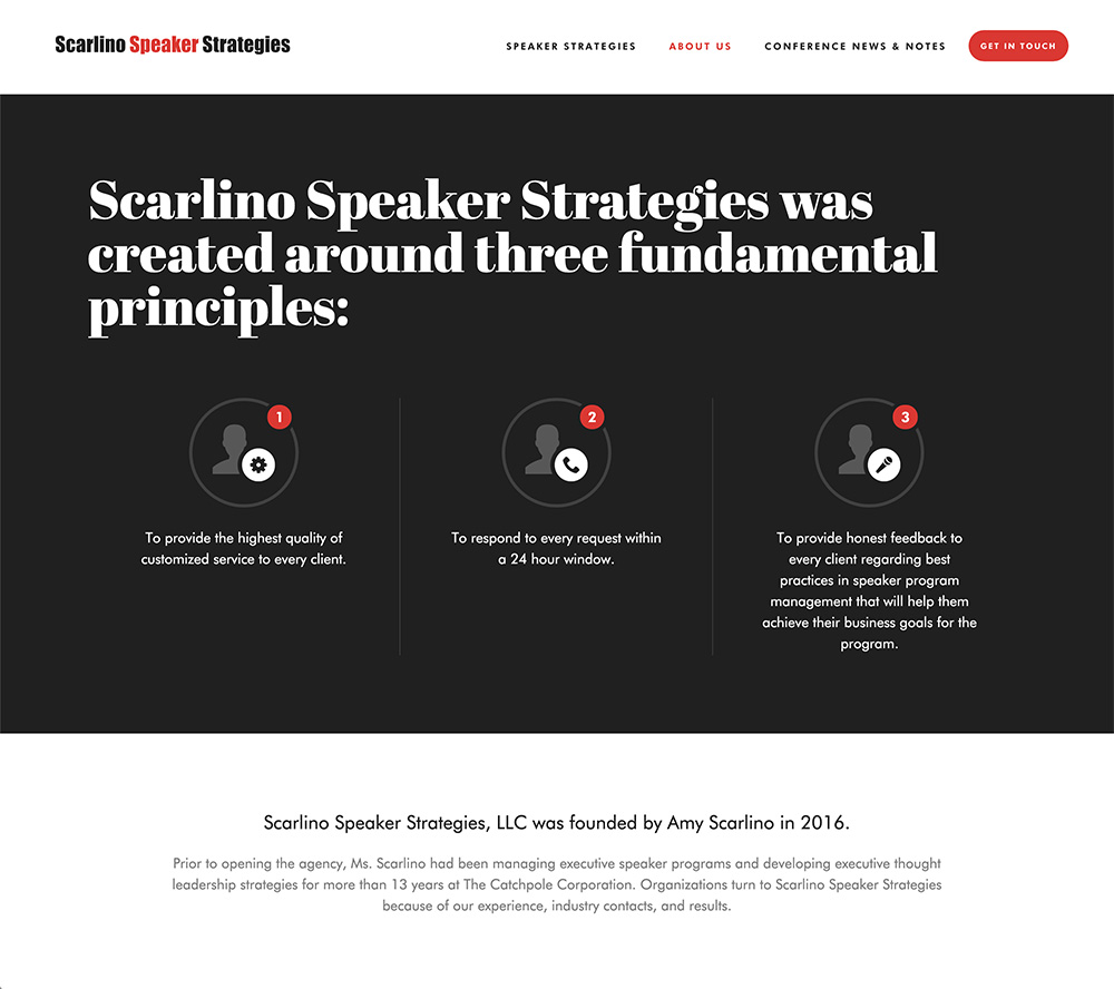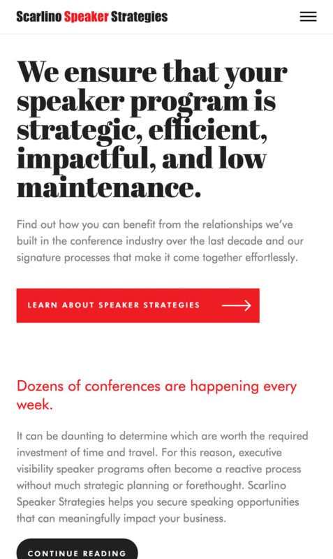 Sometimes high quality unique images aren’t available to design with. The solution for Scarlino Speaker Strategies was to use strong typography with bold colors as the main design elements. This confident approach reflects their brand, and sends the right message to their customers.