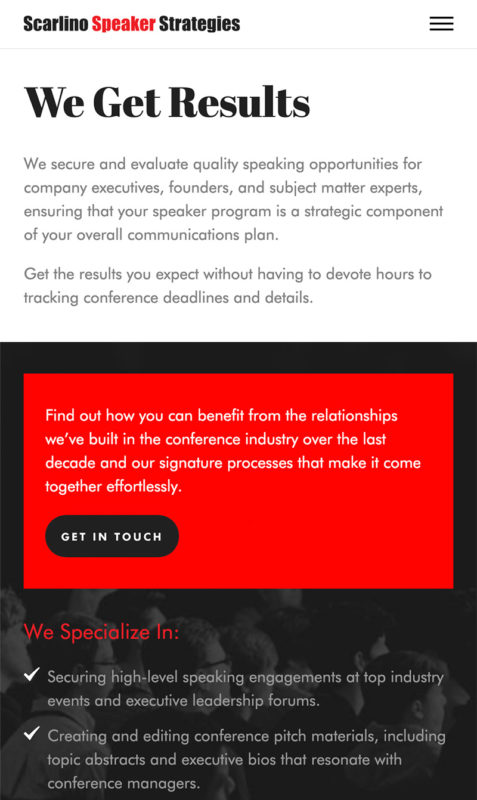 Their new responsive website design uses a bold new look that’s easy to navigate. It was designed on the WordPress CMS to allow Scarlino Speaker Strategies a quick and simple way to make updates when needed.