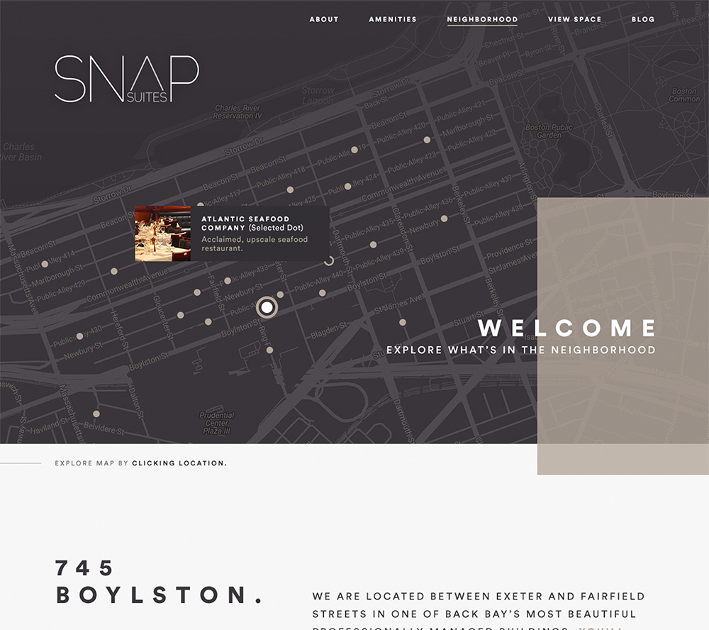 Using Google’s Maps JavaScript API, we designed and built a content-managed map in WordPress that allows Snapsuites to easily add nearby restaurants and attractions.