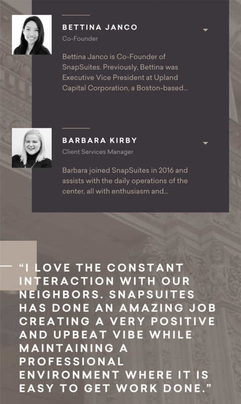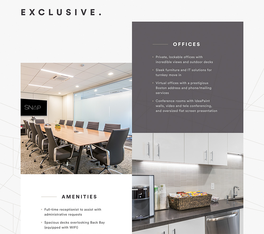 SnapSuites is a membership-based office center located on Boylston Street in Boston’s Back Bay. They offer spacious private offices, innovative technology, incredible work/lifestyle amenities, and receptionist support. Members are executives, entrepreneurs, and businesses of all sizes — both national and regional — looking for high image space with none of the associated up-front capital.