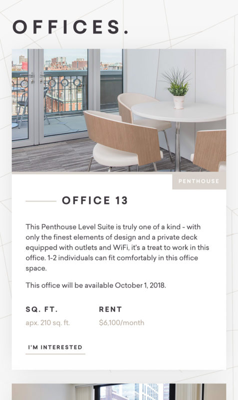 We designed the office pages aound a 3D virtual tour tool powered by Matterport so users can click their way thorough the different suite options.