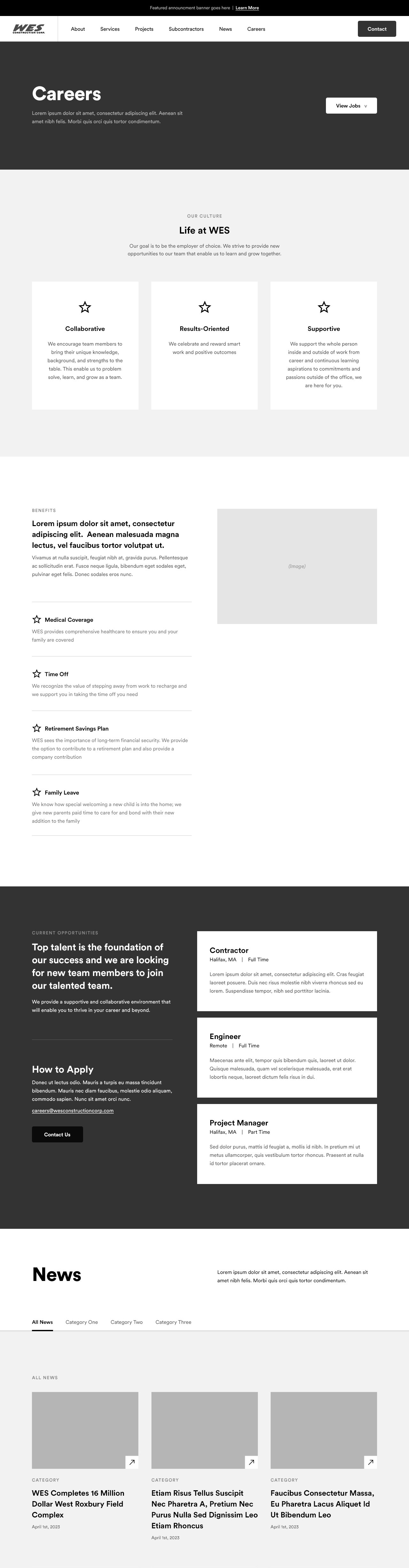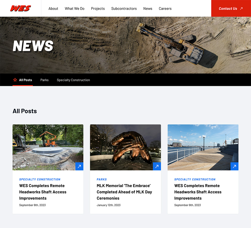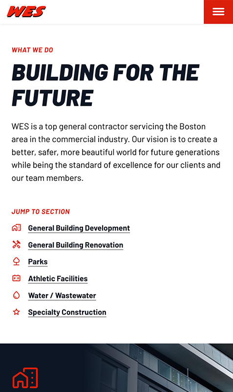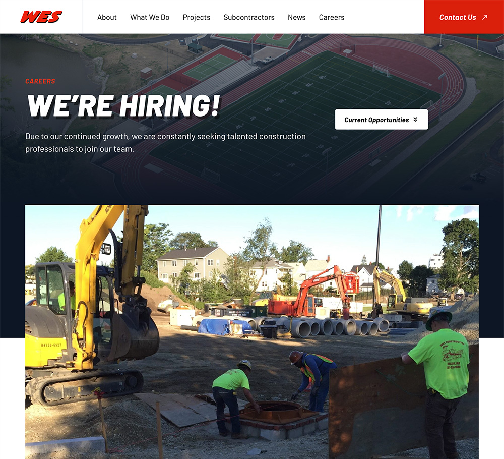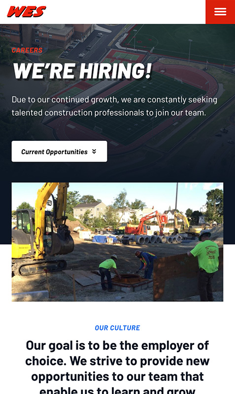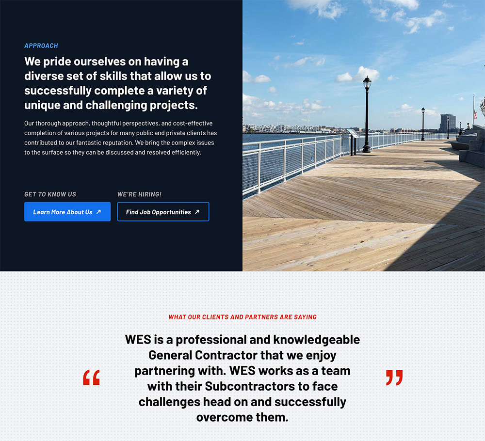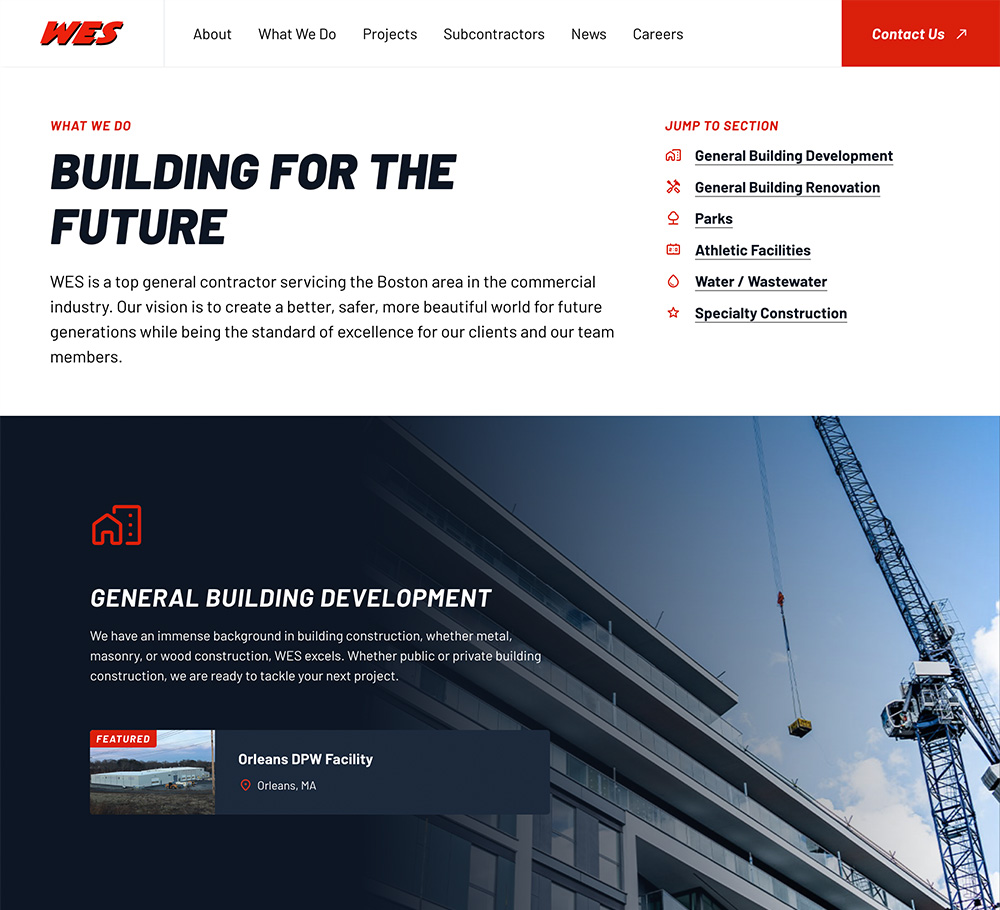 WES Construction needed a new, modern site that allowed them to maintain it themselves over time. They opted to keep the site really clean by showing only a few projects in each category. As more projects finish up, they’ll be able to easily add them to the site. Metropolis used large images to show the quality of their work, and carefully used their bold red to highlight the important messages and CTAs throughout the site.