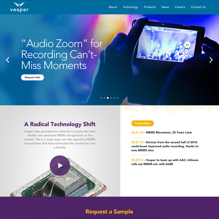 BOSTON — (June 13, 2016) – Metropolis has rolled out a new website for a startup that is creating a lot of industry buzz: Vesper, developer of the world’s most advanced acoustic sensors. Metropolis worked closely with Vesper and Vetrano Communications to redefine Vesper’s brand and to create a new responsive website design. Custom photography and videography was done Metropolis and Jeff Cutler.